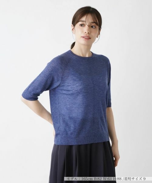 軽快な印象を与える五分袖のニットプルオーバー。浅めのクルーネックが上品な佇まいを演出。袖付けはラグランカットで肩肘張らないストレスフリーの着心地を叶えました。肌当たりのよい薄手のニットなので着こなしやすく、爽やかな風合いの中にも優しいぬくもりが感じられます。フロント中央に施した切り替えラインがさりげないアクセントに。無駄な装飾を省いたミニマルなデザインでボトムスとも合わせやすく、様々なコーディネートで活躍してくれそうなアイテムです。