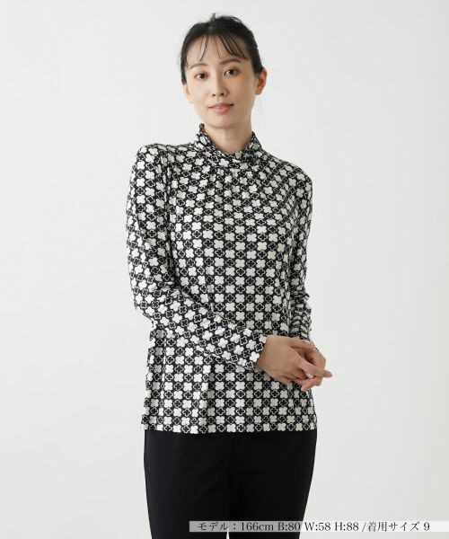 どこか懐かしさを感じさせる、レトロテイストの幾何学フラワー柄がお洒落な雰囲気を演出するハイネックカットソー。ネックラインにはドレープ感を作り、女性らしい柔らかなニュアンスに。すっきりとしたシルエットでボトムスともバランスよくコーディネートできる一枚。定番のベーシックな無地のパンツでまとめるのはもちろん、フェミニンなロングスカートを合わせたキレイめの着こなしもおすすめです。
