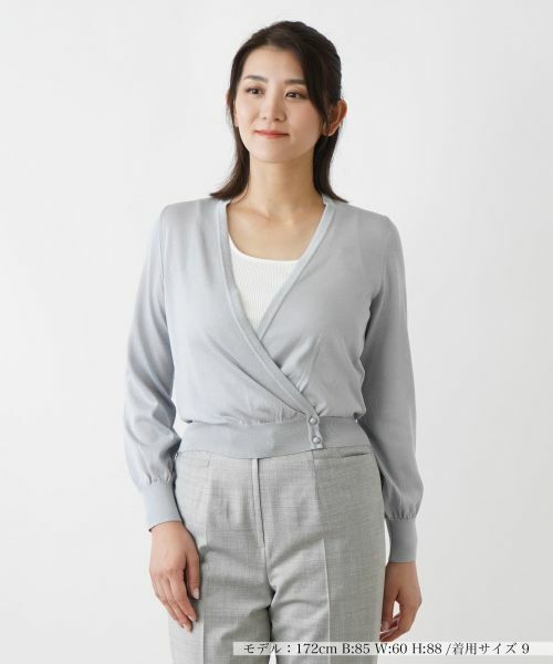 ほんのりとラメが煌めくニットが、さりげなく大人のエレガンスを主張するカシュクールデザインのカーディガン。レーヨンにナイロンをブレンドしてハイゲージで編み上げたニットの優しい温もりが感じられる一枚です。ネックラインは深めに開きをもたせ、絶妙なバランスの抜け感を演出。スポーティな定番のパンツですっきりとまとめるのはもちろん、フェミニンなロングスカートとも好相性のアイテムです。