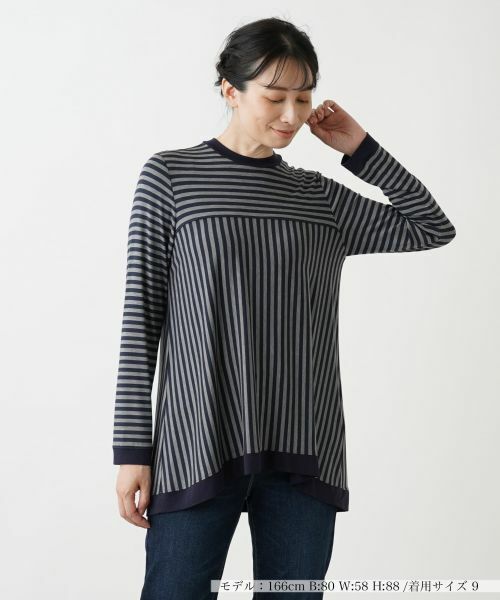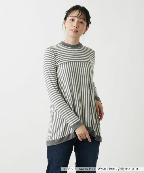 巧妙な切り替えボーダーが目を惹く、新鮮な印象を与えるデザインのトップス。首元は詰まったネックラインになっており、上品で落ち着いた雰囲気を演出。裾に向かって優雅に広がるフレアシルエットが、女性らしい柔らかさを際立たせ、エレガントなニュアンスをプラス。やや長めの丈感で、体のラインをさりげなくカバーしつつ、細身のパンツと合わせることでバランスの取れた美しいコーディネートが完成します。