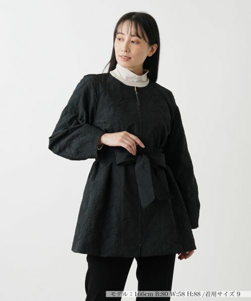 アンティーク調のボタニカル柄を刺繍した、格調高い趣のノーカラージャケット。フロントはジップアップ仕様でスムーズに着脱が可能。すっきりとした襟ぐりはタートルネックトップスと好相性。ハイウエストでリボンベルトをマークすれば女性らしい華やかな印象に仕上がり、スタイルアップ効果も狙えそうです。身体のラインを拾いにくく、細身のパンツとのコーディネートもバランスよくまとまります。