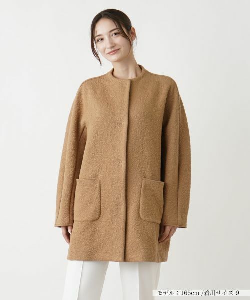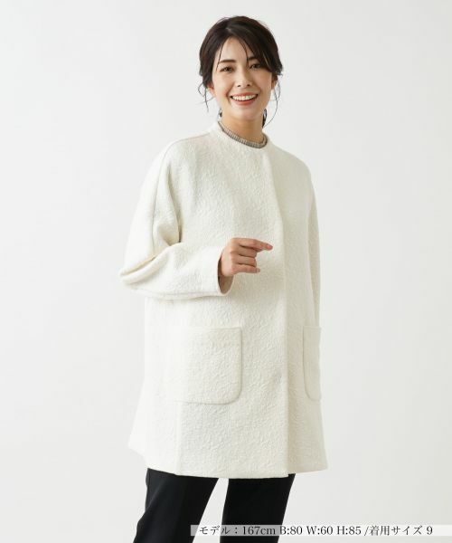 膨れジャカード織りのセミロング丈ノーカラージャケット。立体感のある織り柄が洗練された雰囲気を醸し出し、存在感のある一着に仕上がっています。比翼仕立てのフロントはスナップボタンによりスムーズに着脱が可能。前ウエストの左右にはシンプルなパッチポケットをレイアウトしています。ヒップを程よく隠す丈感で体型をナチュラルにカバーしつつも、スタイルを美しく見せてくれるデザインがポイント。カジュアルからエレガントまで、幅広いシーンで活躍するアウターです。