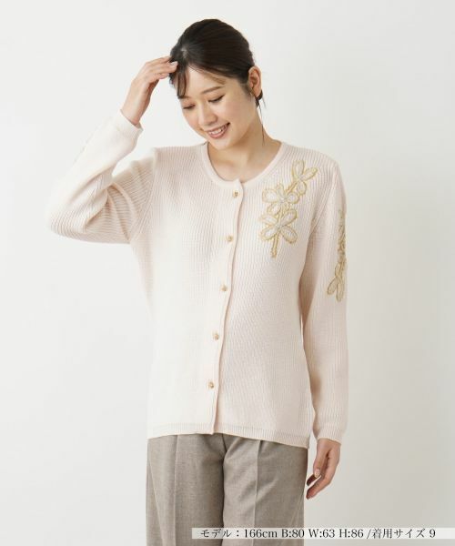 ショルダーや袖周りにクリスタルガラスパーツが煌めくエレガントなフラワー刺繍が大胆に施された、クルーネックカーディガン。繊細に作り込んだデコラティブなフロントボタンも相俟って、クラシカルな趣を感じさせるデザインに。シルエットには程よくゆとりをもたせ、肩肘張らないリラクシーな着心地を叶えました。ワイドパンツでまとめたカジュアルなスタイルはもちろん、ミモレスカートを合わせたフェミニンルックとも好相性のアイテムです。