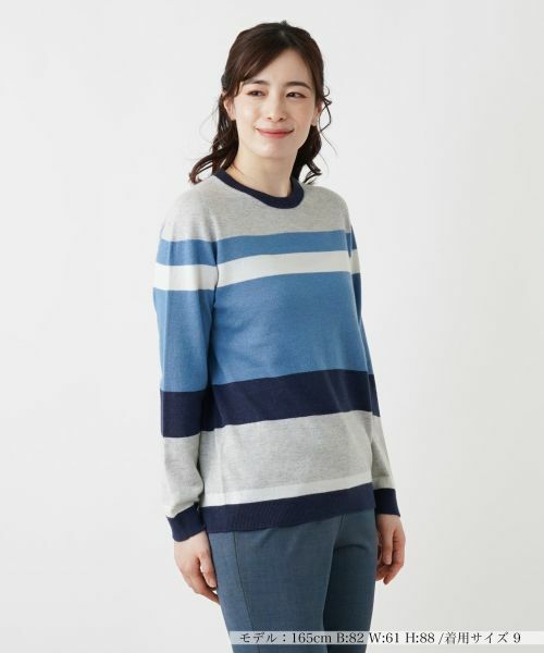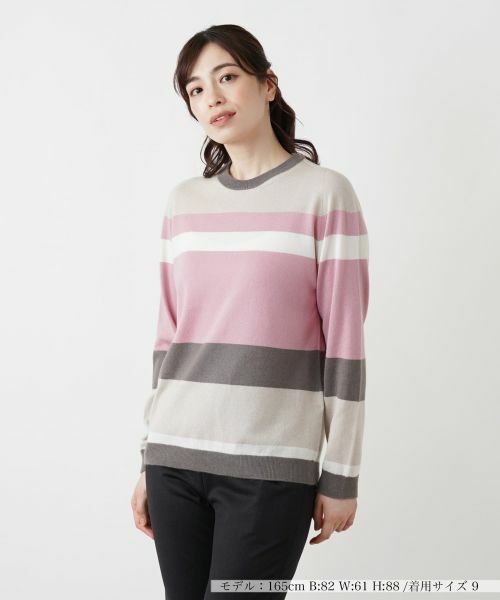 明るめの色合いで描かれたグラフィカルなボーダーが印象的なクルーネックニットプルオーバー。カシミヤにシルクをブレンドし、ハイゲージで丁寧に編み込まれたニットの優しい温もりが感じられる一枚。浅めのネックラインが上品で落ち着いた雰囲気を演出し、シンプルな中にも洗練されたニュアンスが漂います。パンツと合わせてスポーティに、あるいはスカートと合わせてフェミニンに仕上げるなど、着こなしのバリエーションも自在。デイリーからちょっとしたお出かけまで幅広く活躍するアイテムです。