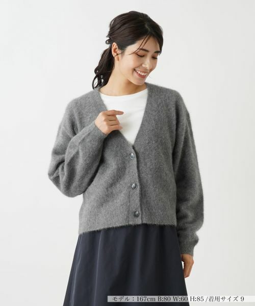 ヘアリーなニットの風合いが楽しめる、Vネックカーディガン。ふんわりと柔らかな質感がシーズンムードを盛り上げ、着るたびに優しい肌触りを実感できます。深めに開いたネックラインは顔周りをすっきりと見せるだけでなく、絶妙な抜け感を演出。袖にはふんわりとした膨らみをもたせ、リラクシーで快適な着心地を実現しています。マーブルボタンが細部にまでこだわりを感じさせる上品なアクセントとなり、エフォートレスシックなスタイルを後押しする着回しやすいアイテムです。------------------------------------着用シーズン:冬伸縮性:あり透け感:なしポケット:なし生地の厚さ:やや薄手裏地:なし-------------------------------------※商品の色味は、撮影場所や光のあたり具合、お客様のお使いの機器により色味が違って見える場合がございます。予めご了承ください。家庭洗濯不可漂白不可タンブル乾燥不可アイロン不可石油系溶剤ドライクリーニング弱ウェットクリーニング不可