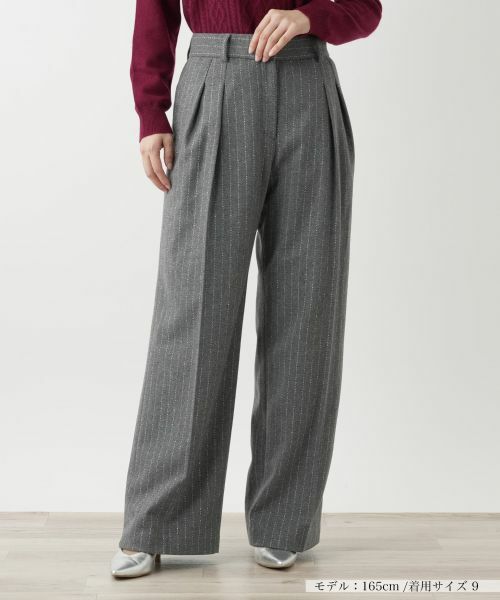 レトロシックなピンストライプのワイドパンツは、どこかクラシカルな雰囲気を漂わせつつモダンな印象を演出します。ツータックのディテールにより立体感が生まれ、リラックス感を持ちながらも上品さを感じさせるシルエットに。ウエスト部分には適度な伸縮性があり、フィット感が心地よく、快適なはき心地をキープ。ハイウエストデザインのため、トップスをタックインすることで脚を長く見せるスタイルアップ効果も期待できそうです。スナップボタン&サイドホック、ファスナーにより開閉が可能。