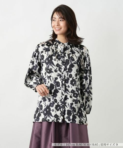 ワントーンで描かれた手描き風のフラワープリントが目を惹く、バンドカラーブラウス。ふんわりとしたボリュームスリーブと、ゆったりとしたシルエットが生み出す柔らかな佇まいが女性らしい優しげなニュアンスを演出。袖口はゴム仕様となっており、さりげなくフィットしつつ、腕まくりしやすいのも嬉しいポイント。ヒップまで隠れる丈感がナチュラルな体形カバーを叶え、気負わず着こなせる一枚です。
