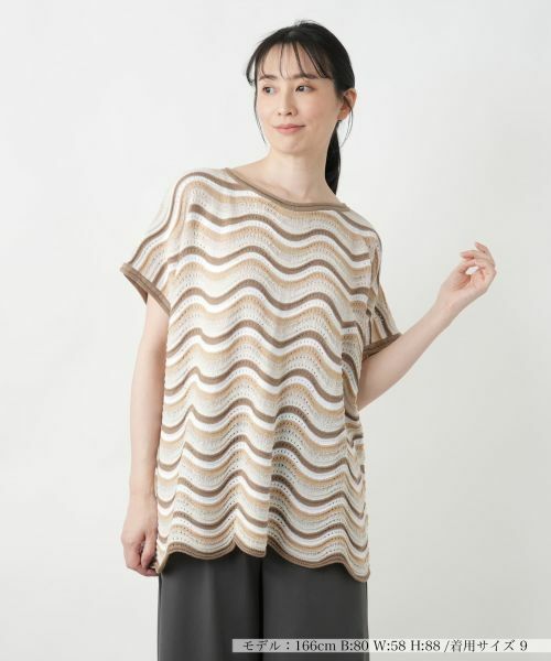 ラメが煌めくウェーブボーダーが視覚的なインパクトを放つニットベスト。ネックラインはすっきりと開き、絶妙なバランスの抜け感を演出。程よくゆとりをもたせたリラクシーなシルエットが、こなれた大人の雰囲気を引き立てます。透かし編みの軽やかな風合いが心地よく、涼やかに着こなせる一枚。シンプルなインナーと合わせてレイヤードを楽しんだり、ワイドパンツやロングスカートでまとめてモードライクに仕上げたりと、幅広いスタイルにマッチします。