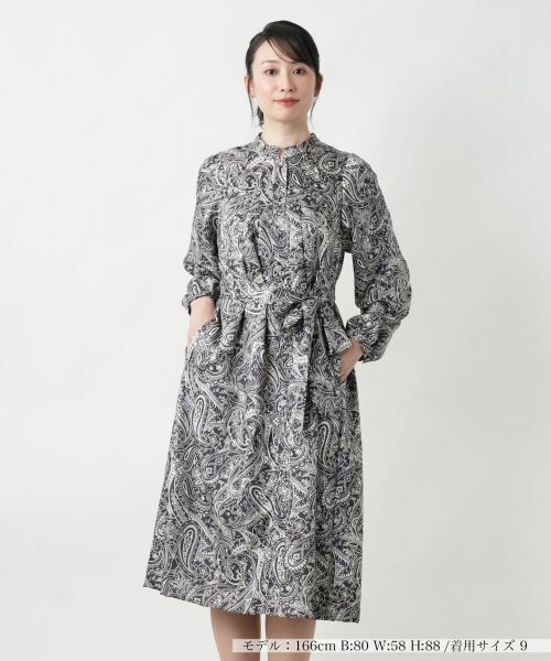 エレガントなペイズリー柄が目を引くロングワンピース。程よいハリ感のある生地が美しいシルエットを作り出し、ウエストリボンでメリハリのあるスタイルを演出できます。袖口はふんわりとしたギャザー仕様で女性らしさをプラス。クラシカルなデザインながらも、動きやすいゆったりとしたシルエットで快適な着心地を提供します。オフィスシーンやお出かけ、ちょっとしたイベントにも活躍する一枚です。ポケット付きで実用性も◎。※定価(税込)は、2025年6月27日のセール開始前の店舗における販売価格です。