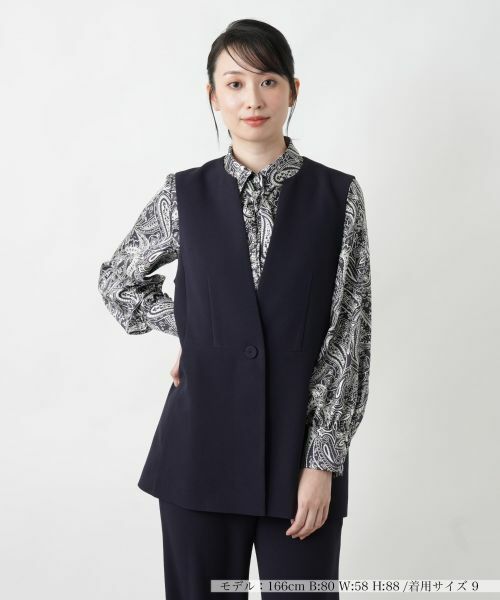 シンプルで洗練されたデザインのロングジレ。フロントにワンボタンを施し、すっきりとしたVネックラインがスタイリッシュな印象を与えます。適度なハリ感のある生地で、シルエットを美しくキープ。ヒップが隠れる丈感で体型カバーにも効果的です。インナー次第でカジュアルからフォーマルまで幅広いコーディネートに対応可能。レーストップスやシャツと合わせれば女性らしく、タートルネックと組み合わせると洗練されたモードなスタイルに仕上がります。※定価(税込)は、2025年6月27日のセール開始前の店舗における販売価格です。家庭洗濯不可漂白不可タンブル乾燥不可アイロン低温160℃までドライクリーニング可ウェットクリーニング不可