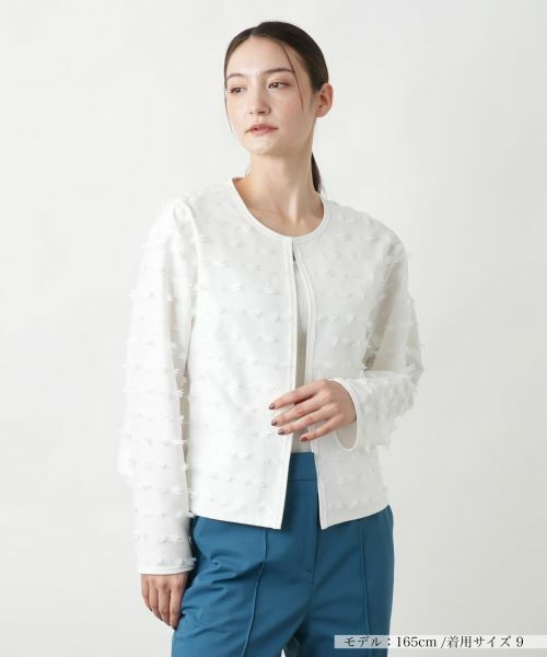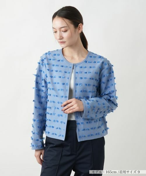 ユニークな立体感のあるデザインのジャケットです。全体に施されたフリンジのようなディテールが、動きのある個性的な印象を演出します。シンプルなインナーと合わせるだけでおしゃれなコーディネートが完成。フロントホック仕様で、すっきりとしたシルエットをキープしながら着用できます。オン・オフ問わず活躍するアイテムで、カジュアルにもエレガントにもスタイリング可能です。※定価(税込)は、2025年6月27日のセール開始前の店舗における販売価格です。家庭洗濯不可漂白不可タンブル乾燥不可アイロン低温120℃まで石油系溶剤ドライクリーニング弱ウェットクリーニング不可