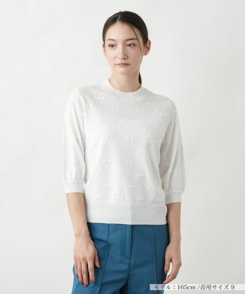 リボンモチーフの編み柄が愛らしいニットプルオーバー。シンプルなクルーネックデザインで上品な印象に。ふんわりとしたスリーブが女性らしいシルエットを演出。デイリーからオフィスまで幅広く活躍する一枚です。※定価(税込)は、2025年6月27日のセール開始前の店舗における販売価格です。手洗い可漂白不可タンブル乾燥不可つり干し(日陰)アイロン低温160℃まで石油系溶剤ドライクリーニング弱ウェットクリーニング(弱い処理)