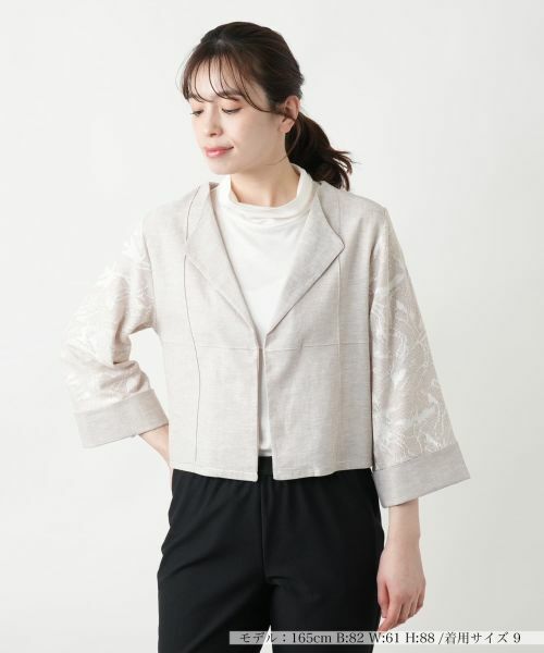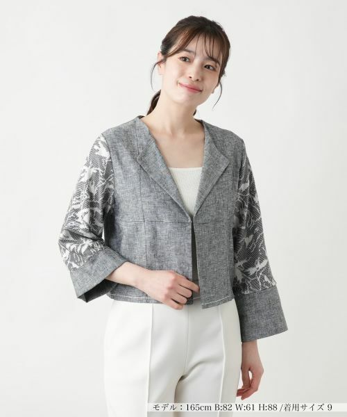 スリーブ部分に手の込んだ柄をあしらい、巧妙にアクセントを加えたショート丈のテーラードジャケット。端正なフォルムのラペルが品のある佇まいを後押しします。フロント部分は鍵ホック留めでミニマルな仕上がりに。ボディラインをすっきりと見せる計算されたシルエットで、パンツと合わせればシャープに、ワンピースやフレアスカートでまとめればエレガントな装いも仕上がり、シーンを選ばずに幅広く活躍する一着です。
