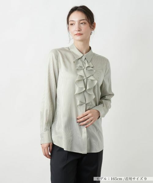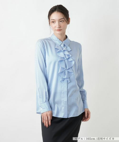 フロントの華やかなフリルデザインが特徴の長袖シャツ。ストライプ柄が上品で洗練された印象を演出。ゆったりとしたシルエットで、快適な着心地を提供。※定価(税込)は、2025年6月27日のセール開始前の店舗における販売価格です。家庭洗濯不可漂白不可タンブル乾燥不可アイロン低温160℃まで石油系溶剤ドライクリーニング弱ウェットクリーニング不可