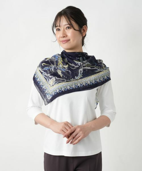 オリエンタルムード漂うリーフ柄が視線を惹きつけるボリュームスカーフ。存在感のあるプリントが装いに奥行きを加え、コーディネートのアクセントとして華やかに映えます。やや薄手の軽やかな生地を使用し、これからの季節らしいふんわりとした柔らかな風合いが心地よい仕上がりに。さらりと首元に巻いてエレガントに演出するのはもちろん、肩にさりげなく羽織ればリラックス感のあるスタイリングも楽しめます。