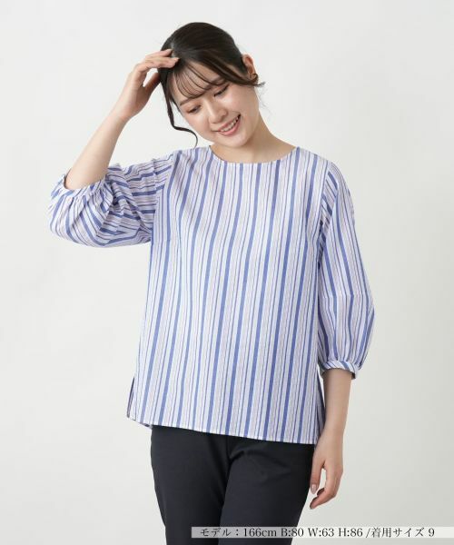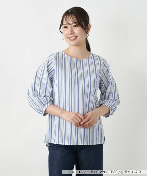 リズミカルにオルタネイトストライプが描かれた、これからの季節らしいデザインのクルーネックブラウス。コットンにポリエステルをブレンドした爽やかな風合いの生地を使用し、リラックス感のある着心地を実現しました。ネックラインはすっきりと開きをもたせ、裾にはサイドスリットを入れ、絶妙なバランスの抜け感を作り出しています。ふんわりとしたスリーブラインが優しげなニュアンス。バックネックの涙あきはボタン開閉が可能。