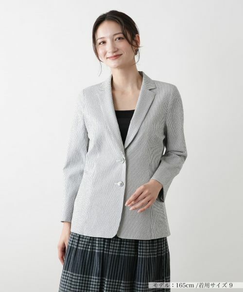 細かなストライプ柄をあしらった、凹凸感のあるリップル生地で仕立てたテーラードジャケット。肩パッド入りで軽やかな着心地と立体的な表情を兼ね備え、シンプルながらも個性を感じさせる一着です。すっきりとしたシルエットはインナーやボトムスを選ばず幅広いスタイリングにマッチ。袖口にはスリットが施されており、折り返して抜け感を加えるアレンジも可能。デイリーからオフィスカジュアルまで、気軽に取り入れられる優秀なアイテムです。