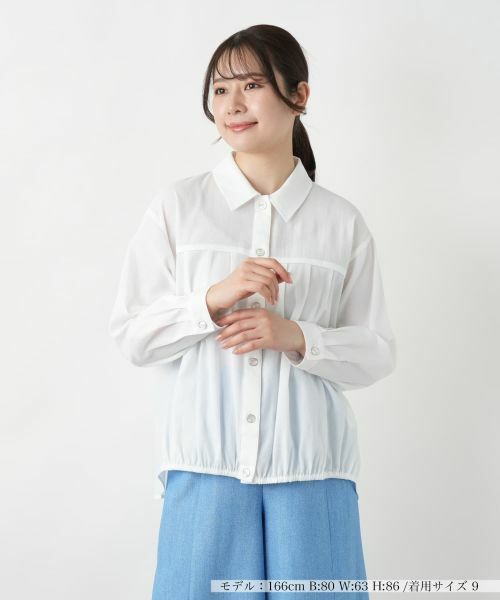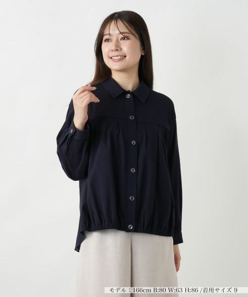 繊細さとリラクシーさを兼ね備えた、涼やかに羽織れる襟付きブラウス。ゆったりと落ちるドロップショルダーや前後に施したタックが生み出すエアリーなシルエットが魅力。肩の力を抜いたナチュラルな着心地でありながら、顔まわりを引き締める端正な襟元が、装いにきちんと感を添えてくれます。ボタンはほんのり光沢を放つ貝調ボタンをセレクト。さりげないアクセントとして、控えめながらも上品なニュアンスを添えています。生地には伸縮性があり、前裾のみゴムが施されています。