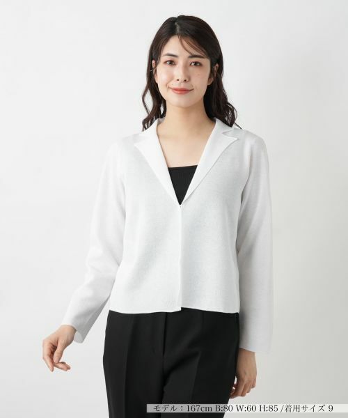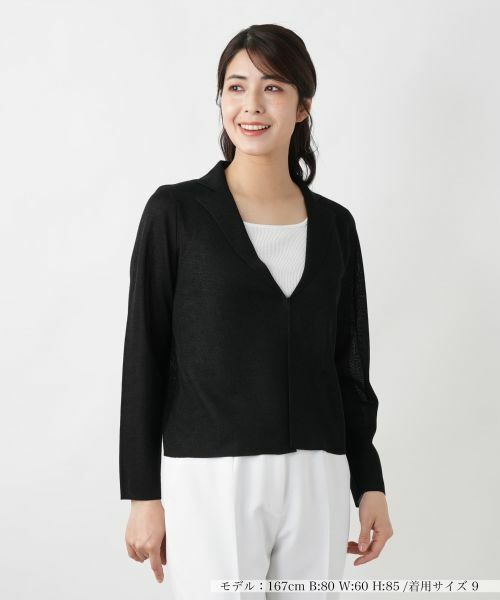 レーヨンにポリエステルをバランスよくブレンドし、やさしいタッチで甘く編み上げたニットジャケット。ほんのり光沢感を感じさせるソフトな風合いが、装いに品の良さを添えてくれます。顔まわりに印象をもたらすラペルは、きちんと感と女性らしさを両立。すっきりと開いたVネックラインが軽やかな抜け感を演出します。フロントはホック仕様で無駄のないミニマルなルックスに。ブラウスやカットソーにさっと羽織って、オンオフ問わず活躍するアイテムです。------------------------------------着用シーズン:初夏伸縮性:あり透け感:ありポケット:なし生地の厚さ:薄手裏地:なし-------------------------------------※商品の色味は、撮影場所や光のあたり具合、お客様のお使いの機器により色味が違って見える場合がございます。予めご了承ください。※定価(税込)は、2025年6月27日のセール開始前の店舗における販売価格です。家庭洗濯不可漂白不可タンブル乾燥不可アイロン低温160℃まで石油系溶剤ドライクリーニング弱ウェットクリーニング不可