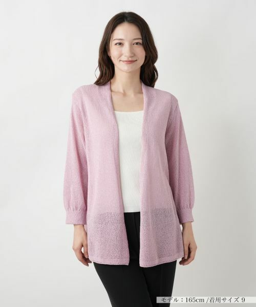 軽やかなペーパー素材を編み上げ、通気性に優れた快適な着心地を実現したトッパーカーディガン。肌離れのよいさらりとした質感がこれからのシーズンにぴったり。フロントはあえてノーボタンで仕立て、すっきりと洗練された印象に。ヒップまわりまで自然に包み込むシルエットで体形をやさしくカバー。ブラウスやカットソーの上にさっと羽織るだけで、上級者らしいレイヤードスタイルが完成します。デイリーカジュアルからお出かけシーンまで、幅広く活躍してくれるアイテムです。