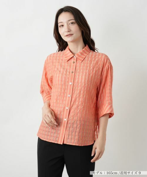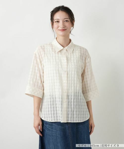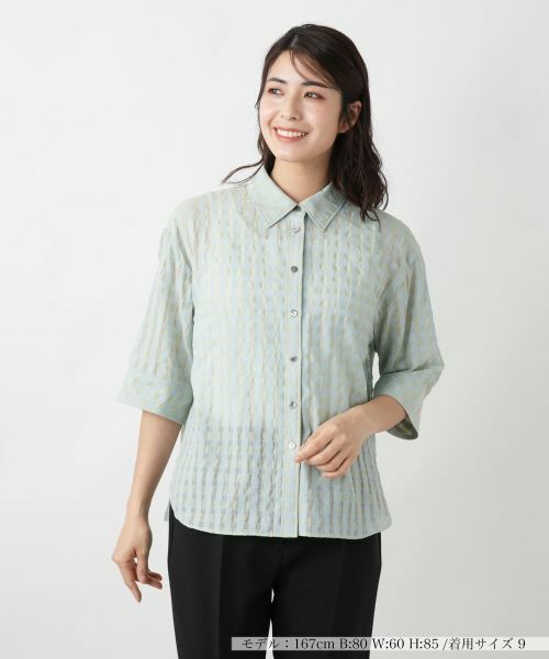 ほんのり透けるシアーチェックが、見た目にも涼しげな印象をもたらすブラウス。肩のラインを落としたドロップショルダーが自然なリラックス感を演出。やや短めのクロップドスリーブは、肌を見せすぎずに程よい抜け感を作り、こなれたバランスに。裾にはサイドスリットとラウンドカットヘムを施し、動きに合わせて揺れる柔らかなニュアンスをプラス。品のあるカジュアルスタイルが楽しめるトップスです。