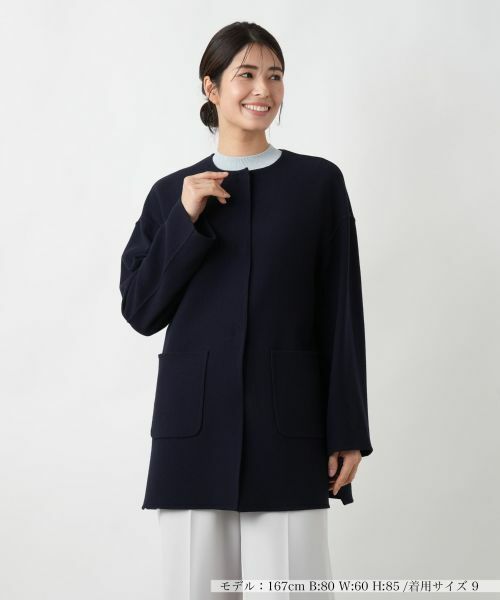 大人の女性らしい落ち着いたシックな色合いでデザインした、一重仕立てのショート丈ノーカラーコート。すっきりとしたフロントはスナップボタン留めでスムーズに着脱が可能。裾にはサイドスリットを入れ、動きやすさにも配慮しています。前ウエスト両サイドにはシンプルなスクエア型のポケットをバランスよくレイアウト。ヒップまで隠れる程度の丈感でナチュラルに体型カバーできるのも嬉しいポイント。