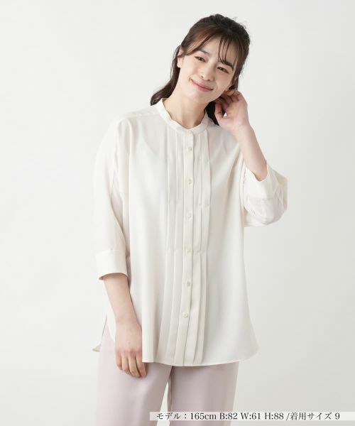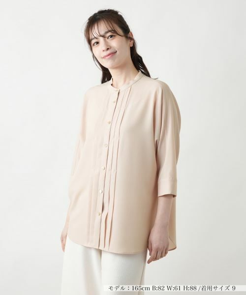 軽やかな雰囲気で着こなせる、ゆったりとしたドルマン風のクロップドスリーブが特徴のバンドカラーブラウス。フロントに施したタックが縦ラインを強調し、エレガントな表情をプラス。上品な風合いのやや薄手の生地感が涼やかな印象を与え、動くたびにしなやかに揺れるシルエットも相俟って、大人の女性らしさを引き立てます。さらにラウンドカットヘムがこなれた抜け感を演出。合わせるボトムスを選ばず、幅広いコーディネートにマッチするトップスです。