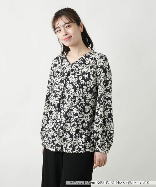 幾何学的なフラワーモチーフとロゴのコンビネーションが冴える、モダンなデザインのブラウス。ネックラインは程よく開きを持たせ、女性らしい抜け感を演出。巧妙に施されたタックが立体的なシルエットを作り出し、余裕を感じさせるエレガントな着こなしが完成します。ワイドパンツと合わせてリラックス感のある大人カジュアルに、スカートでまとめればフェミニンなスタイルにも仕上がり、幅広いコーディネートで活躍する一枚です。カフス部分、バックネックの涙あきはボタン開閉が可能。
