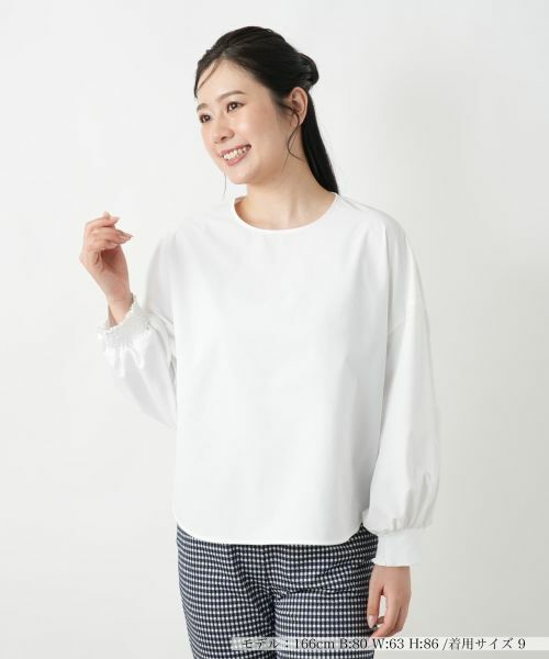 袖の内側にループがあり、留めることでタックディテールを作ることが出来る2WAYタイプのブラウス。スタイリングによって、お好みでの着こなしが楽しめます。コットンのような表情感と風合いのポリエスエル素材を使用しています。さらっとした肌触りが特長。