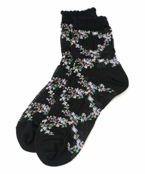 足元をさりげなく彩る、華やかな小花柄のショートソックス。シアーボーダーニットが軽やかで、これからの季節にぴったりの涼しげな印象を演出。履き口には繊細なフリルをあしらい、ほんのりフェミニンな甘さをプラス。カジュアルなデイリースタイルにはもちろん、エレガントな大人のコーディネートにも優しくマッチ。スニーカーやフラットシューズと合わせて、ひと味違ったアクセントを楽しめる一足です。