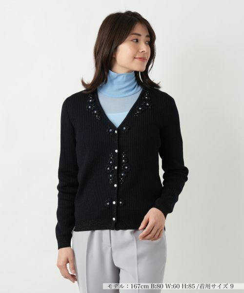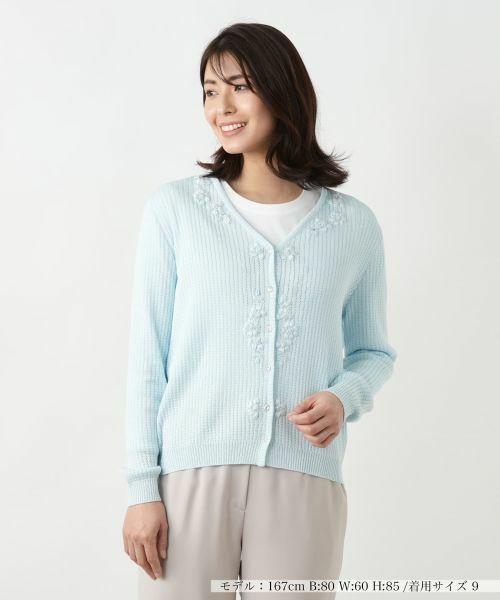 フロントにデコラティブなフラワー刺繍やビジューボタンを施した、存在感のあるVネックカーディガン。ラメの煌めきも上品なアクセントとなり、コーディネートにさりげない華やかさを添える一枚。コットンとレーヨンをブレンドし、軽やかな透かし編みで仕立てることで涼やかな風合いを実現しました。ゆったりと開いたVネックが顔周りをすっきりと見せつつ、絶妙な抜け感を演出。羽織るだけでこなれた雰囲気をプラスしてくれる、これからの季節の装いにぴったりの一枚です。