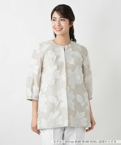 巧妙な異素材使いで花々を立体的に表現した、新鮮さを感じさせるボタニカルデザインのノーカラージャケット。軽やかな風合いのファブリックを使用し、見た目にも涼やかな印象に。ラグラン仕様のクロップドスリーブが肩まわりをやさしく包み込み、着心地はストレスフリー。フロントはホックで留める仕様に仕上げ、全体の佇まいをバランスよくミニマルに引き締めています。