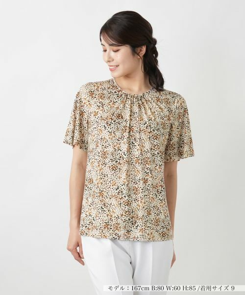 アートなモザイク調のプリントがインパクトを放つカットソー。ネックまわりに施されたギャザーが、デコルテにやわらかなドレープを生み、女性らしい雰囲気を引き立てます。袖はフレアに広がるシルエットで、腕まわりを優しくカバーしながら軽やかな動きを演出。バックネックにはボタン開閉可能な涙あきを作り、バックスタイルにも抜け感を添えています。一枚でさらりと着こなせる、季節の変わり目に重宝するトップスです。