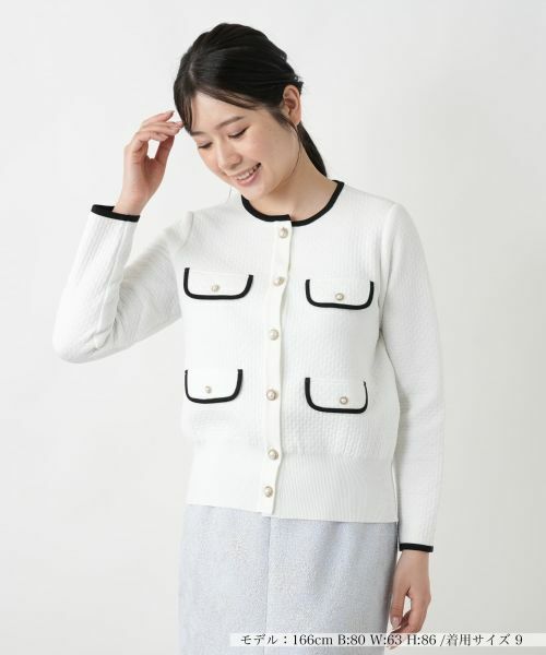 凹凸感のある立体的な編地が洗練された印象を与えるノーカラーニットジャケット。無駄のないすっきりとしたシルエットも相俟って、女性らしいエレガントな佇まいを演出。襟元やポケット、袖口に施された配色ラインのトリミングが、クラシカルな雰囲気をプラスし、存在感のある仕上がりに。デコラティブなパール調ボタンをあしらい、さりげない華やかさと上品なアクセントを添えました。デニムやワイドパンツと合わせてカジュアルダウンした着こなしから、ロングスカートでまとめたきれいめコーデまで幅広く活躍します。(前身頃ポケットは飾りポケットになります。)