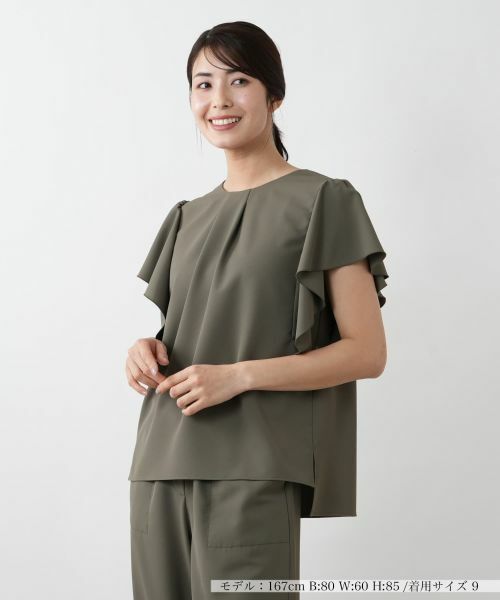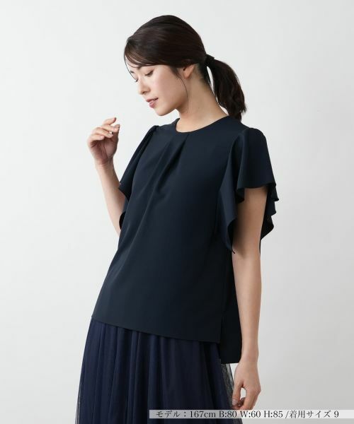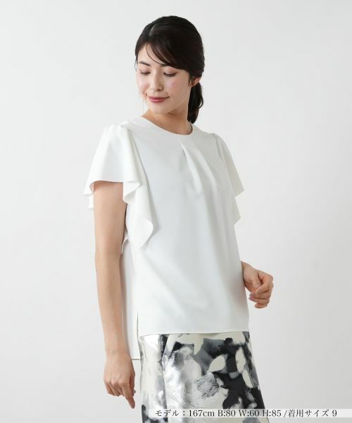 軽やかに揺れるフリルスリーブが、エレガントなドレープ感を生み出すカットソー。フロントネックの中央にはタックを施し、ナチュラルな立体感をプラス。程よいゆとりをもたせることで、ボディラインを拾いすぎず、すっきりとしたシルエットに仕上げています。細部まで計算されたデザインが、快適な着心地と上品な佇まいを両立させています。パンツと合わせればシャープでモードライクに、スカートでまとめてフェミニンに。幅広いスタイリングにマッチし、オンオフ問わず活躍するアイテムです。バックファスナーにより開閉が可能。