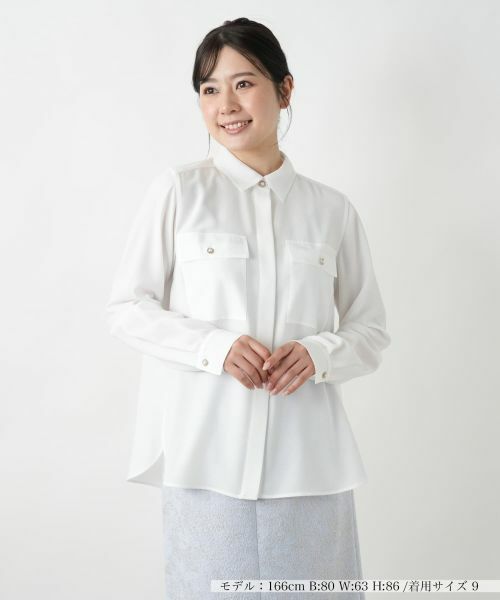両胸にレイアウトされたフラップポケットが存在感を放つブラウス。端正な襟元がシャープな印象を与えつつ、上品な佇まいを演出。フロントには比翼仕立てを採用し、すっきりとしたミニマルな表情を生み出しています。アンティークのようなパール調ボタンがさりげなく輝き、クラシカルなエッセンスをプラス。シンプルながらもディテールにこだわった一枚は、スカートでまとめてフェミニンに、パンツと合わせてマニッシュにも着こなせるアイテムです。