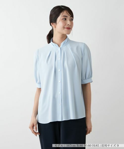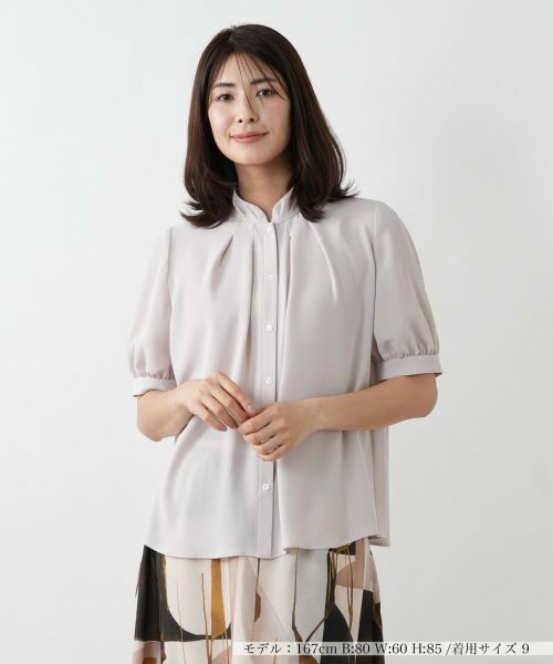柔らかな表情の薄手の生地を使用したスタンドカラーブラウス。ミニマルなデザインながらも、細部までこだわりを感じさせる一枚。フロントにはタックを施し、程よい立体感を演出。身体のラインを拾いすぎず、さりげなく美しいドレープを生み出します。袖には適度なボリューム感を持たせ、ふんわりとした優しいニュアンスをプラス。カフス部分をすっきりとまとめることで、甘さを抑えつつ上品な印象に仕上げました。オンオフ問わず活躍し、多彩なシーンで着回せそうなトップスです。