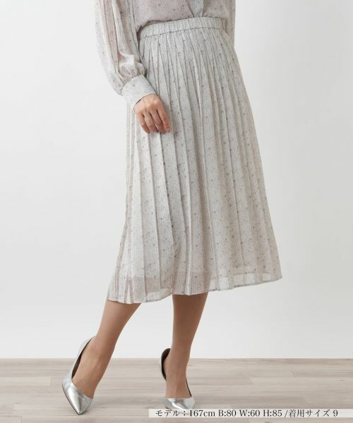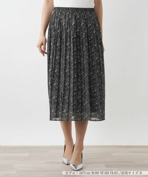 大きさの異なるドットをランダムにちりばめた、ミモレ丈のプリーツスカート。クラシックなドットにニュアンスを加え、洗練されたモダンな印象に仕上げました。細やかなプリーツが縦ラインを強調し、緩やかに広がる美しいシルエットを後押しします。ウエストは総ゴム仕様でストレスフリーなはき心地を実現しました。ブラウスと合わせて大人エレガントな雰囲気に、Tシャツやカットソーと合わせてカジュアルにと、幅広いスタイリングを楽しめる一枚です。