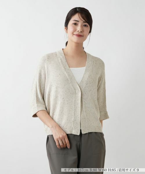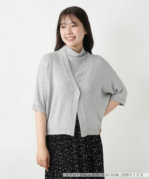 ショート丈の絶妙なバランスとふんわりとしたドルマンスリーブが調和した、大人の余裕を感じさせるリラックスシルエットのカーディガン。全体に散りばめられたラメが上品な輝きを放ち、エレガントな雰囲気を醸し出します。フロントはスナップボタン仕様で着脱もスムーズ。ボタンを留めればきちんと感のあるスタイルに、開けて羽織れば抜け感のある軽やかな表情に。デイリーからちょっとしたお出かけまで、幅広いシーンで活躍する一枚です。