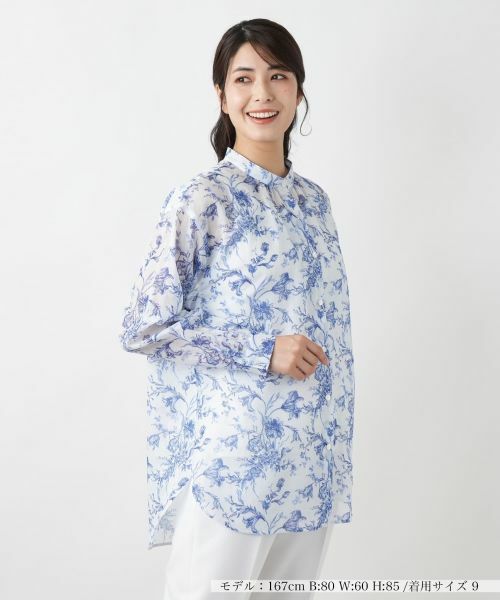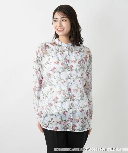 アートを思わせる繊細なフラワー柄のプリントが目を惹くバンドカラーブラウス。コットンに麻をブレンドした通気性のよいファブリックを採用しており、軽やかでさらりとした肌触りが季節に心地よく寄り添います。ゆとりをもたせたリラクシーなシルエットとラウンドカットヘムが作るドレープが、装いに抜け感とエアリーな印象をプラス。タックインもアウトも美しく決まり、パンツにもスカートにも映える一枚です。