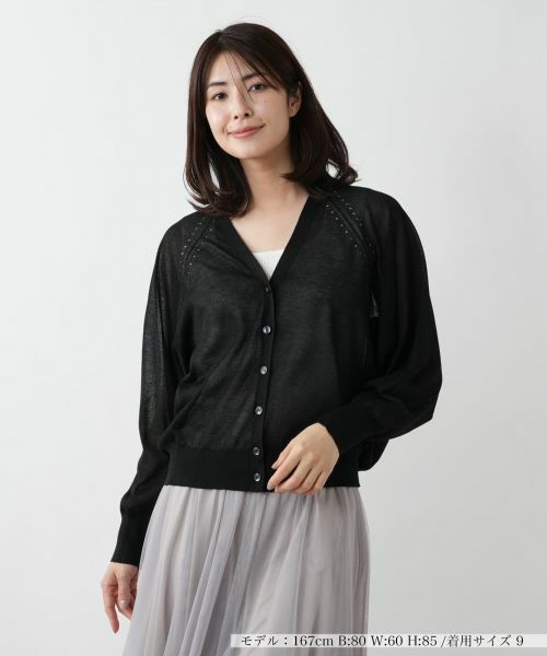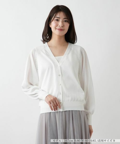 透け感のあるシアーニットが季節らしい軽やかさを演出するドルマンスリーブカーディガン。ネックラインはすっきりと開きをもたせており、シンプルながらも女性らしいエレガントな雰囲気を漂わせる一枚。リラクシーなスリーブが動きに合わせてふわりと揺れ、余裕を感じさせるシルエットを生み出します。Tシャツやキャミソールの上から軽く羽織るだけでこなれたレイヤードスタイルが完成し、冷房対策や日差しよけにも活躍するアイテムです。