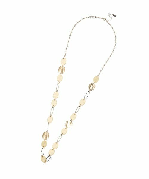 マーブルやメタルといった異なる質感のオーバルモチーフが、リズミカルにチェーンで連なるロングネックレス。異素材のコントラストが絶妙なバランスを生み出します。これからの季節のシンプルになりがちなスタイリングにさりげない個性と洒脱なエッセンスをプラスし、上級者らしいニュアンスのある表情を演出。縦長のラインがコーディネートをすっきりと見せ、遠目からでも存在感を放つ一本です。