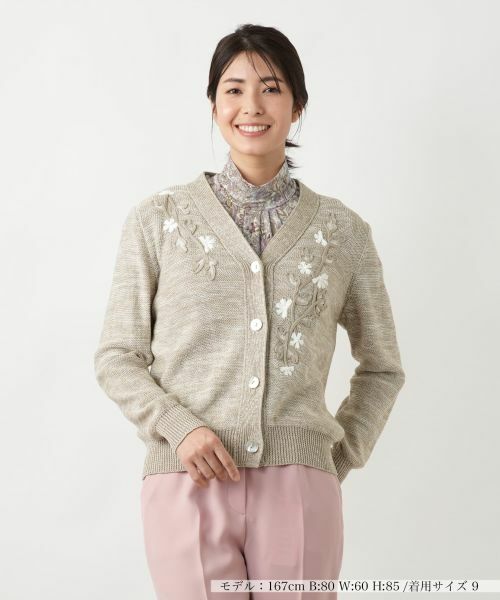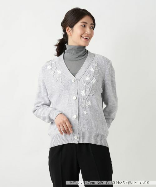 フロントにあしらわれたフラワー刺繍が、フェミニンなエッセンスを添えるVネックカーディガン。シンプルながらも存在感のある一枚に仕上げました。ネックのすっきりとしたデザインが顔周りをシャープに見せつつ、絶妙な抜け感をプラス。丈感も計算されており、カジュアルなパンツにもフェミニンなスカートにもバランスよく馴染むシルエットもポイント。デイリーにはもちろん、ちょっとしたお出かけやオフィスシーンでも活躍する、着回し力の高いトップスです。