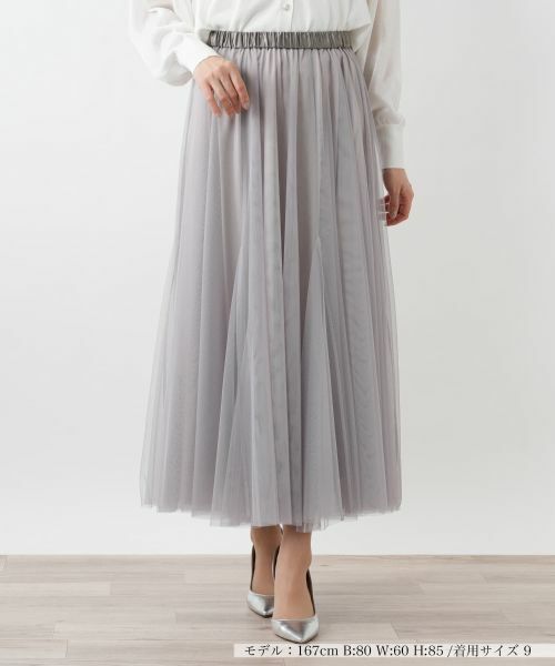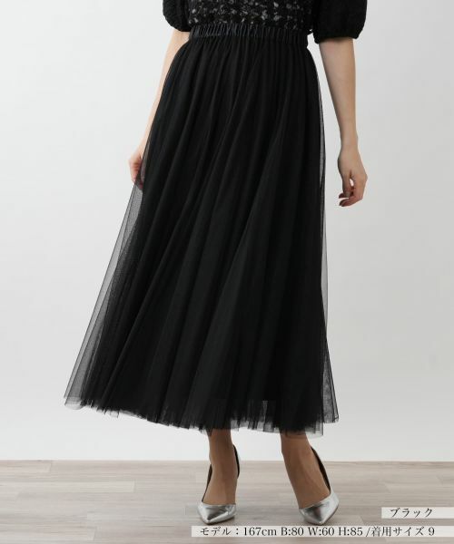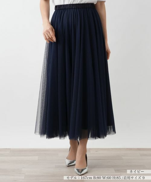 軽やかに揺れるチュール素材が魅力のロングスカート。繊細な透け感が生み出すエアリーな雰囲気が女性らしさを引き立てる一枚。歩くたびにふわりと揺れるシルエットが優雅な動きをプラス。緩やかに広がるAラインシルエットでボリュームがありながらも軽やかな仕立てで、重たくなりすぎず、絶妙なバランスを叶えています。ウエストは総ゴム仕様でストレスフリーなフィット感に。Tシャツやニットと組み合わせればカジュアルダウンした着こなしも楽しめます。