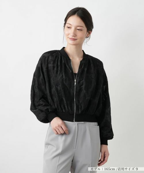 軽やかなシアー素材を用い、立体感のあるフラワー柄をあしらった、季節らしいデザインのフェミニンなブルゾン。ラグランスリーブとふんわりとしたボリュームシルエットが、動きに合わせて優雅なニュアンスを添えています。リブ仕立ての襟と袖口、裾が心地よくフィットし、全体を引き締め、メリハリのあるバランス感を実現します。フロントはジップアップ仕様でさっと羽織れて、デイリーにもリゾートにも活躍する手軽なアウターです。