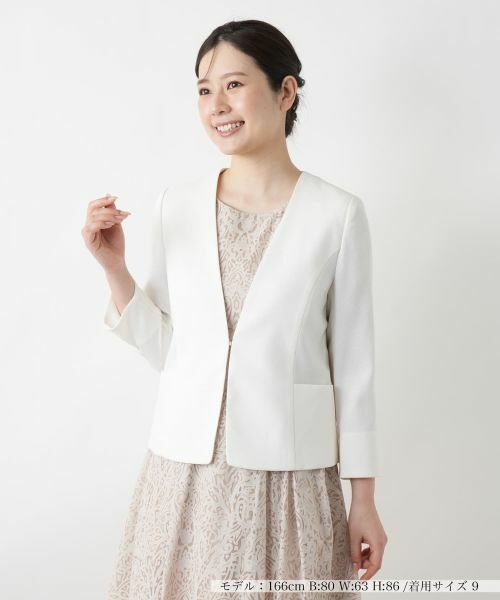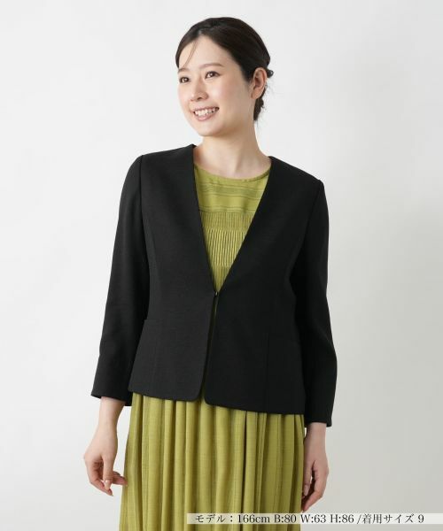 これからのシーズンに嬉しい薄手仕立てのノーカラージャケット。顔まわりをシャープに見せる深めのVネックがスマートな佇まいを演出。ストレッチ性のある生地を採用することで、動きやすさときちんと感を両立しました。ウエストにかけて自然にシェイプされたシルエットが、美しいバランスを描きます。フロントはホック仕様でミニマルに仕上げ、ワンピースやスカートとのフォーマルなスタイリングにもマッチする一着です。