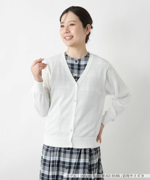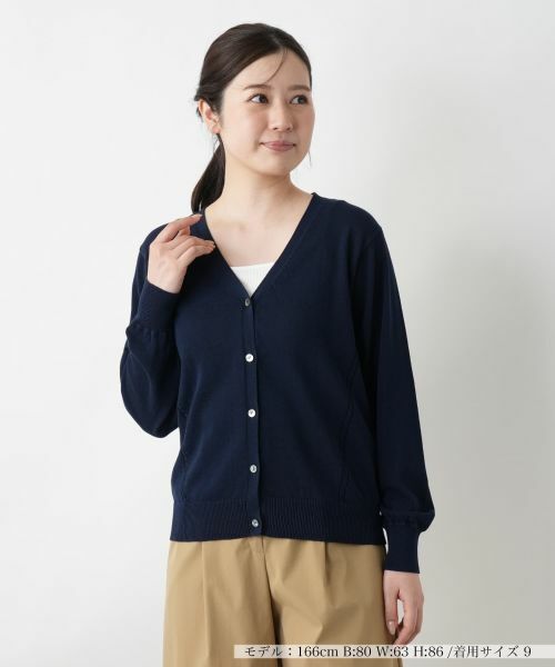コットンをハイゲージで丁寧に編み立てた、軽やかな着心地のカーディガンです。さらっとした薄手の仕上がりで、季節の変わり目の肌寒さや冷房対策にも重宝しそうです。サイドにはさりげないケーブル編みのラインを施し、シンプルな中にもアクセントを添えました。すっきりとしたVネックとベーシックなシルエットでパンツやスカートを選ばず、様々なスタイリングにも合わせやすい一枚です。