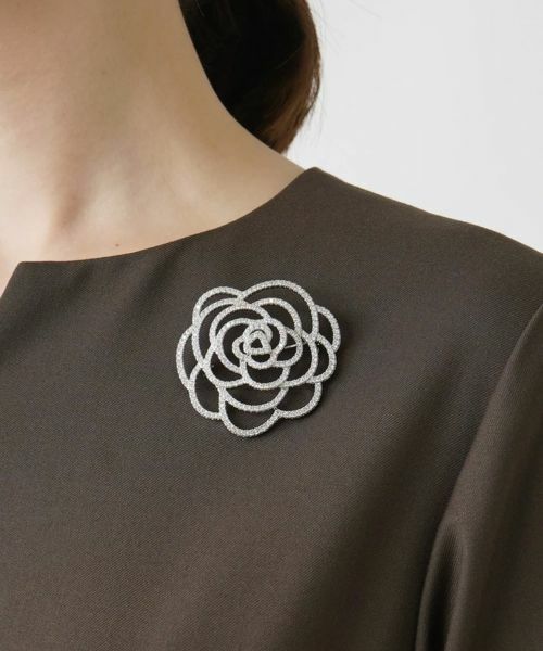 繊細な輝くパーツで、立体感のある花モチーフに仕立て上げたブローチ。ネックレスなどのアクセサリーがなくても、首周りに華やかさをプラスします。装いを一層引き立てる一品です。