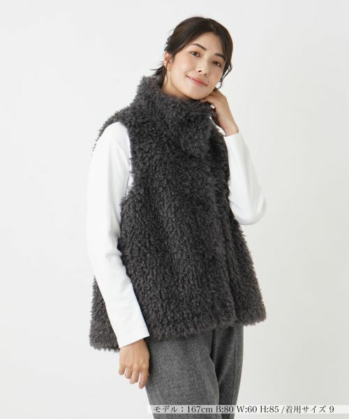 ラムファーを思わせるカーリーな質感のフェイクファーで仕立てたベストは、ふんわりとしたボリューム感と高級感が特徴。首元は優しく包み込むスタンドカラーで、ユニークなシルエットを作り出し、首周りを温かくキープ。後ろ裾をやや長めに設定することで、ヒップラインを自然にカバーし、スタイルをより引き立てるデザインに仕上げています。フロントはボタン開閉でき、着脱もスムーズ。シンプルなトップスやシャツに羽織るだけで、トレンド感のあるスタイリングが完成する一着です。
