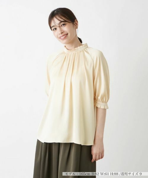 美しい光沢を湛える薄手の生地でデザインしたオーバーブラウス。前後にタック&ギャザーを施し、広がりのある柔らかな表情を作り出しています。袖にはふんわりと膨らみをもたせ、袖付けをラグランカットで仕上げることで、ストレスフリーの着心地を叶えました。ネックや袖口周りにフリルをあしらい、ほんのり甘いエッセンスをプラス。バックネックの涙あきはボタンにより開閉が可能。定番のパンツルックはもちろん、フェミニンなスカートとも好相性のトップスです。